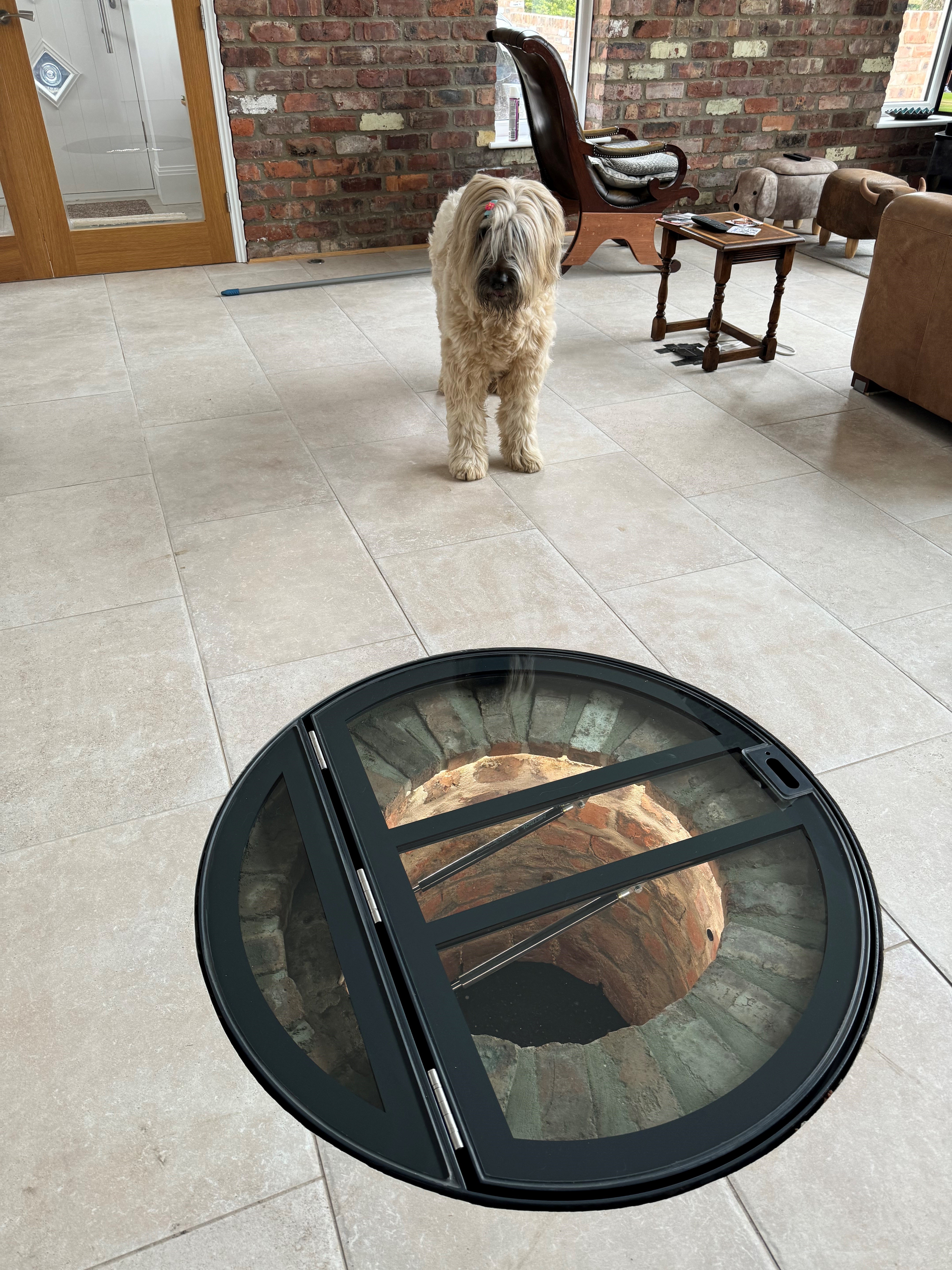 Nick’s discovery of a brick-lined well within his living space required a solution that balanced visibility with accessibility. Unlike a fixed glass panel, this hinged hatch allows the homeowner to open the well for cleaning or inspection without compromising the structural integrity of the floor.