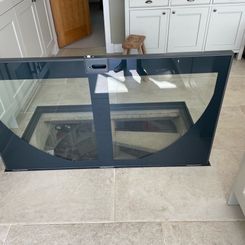 The most frequent issue when replacing a wooden door with a glass hatch is the visibility of the concrete substrate or "raw" opening edges.] Unlike a new-build where everything is flush, a renovation often reveals untidy masonry. To solve this, we don't just supply a clear piece of glass; we utilize back-painted internal borders. By applying a ceramic frit to the underside of the glass in a semi-circular pattern, we create a "mask" that hides the rectangular concrete corners while framing the circular staircase perfectly. Furthermore, since these concrete cellars can be damp, we ensure all hinges and gas struts are positioned to avoid moisture-trap points, ensuring a smooth "Open-Sesame" operation that lasts for decades without the maintenance required by timber.